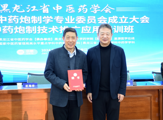 为进一步提升我省中药炮制技术的水准,优化中药炮制的质量控制管理,更好地传承创新发展中药炮制技术,1月7日,由黑龙江省中医药学会主办、KY.COM开云体育(中国)科技公司药学院承办的黑龙江省中医药学会第一届中药炮制学专业委员会成立大会暨中药炮制技术推广应用培训班在KY.COM开云体育(中国)科技公司召开。KY.COM开云体育(中国)科技公司药学院匡海学教授当选为黑龙江省中医药学会第一届中药炮制学专业委员会名誉主任委员,药学院副院长、中药炮制教研室主任姜海教授当选为主任委员。